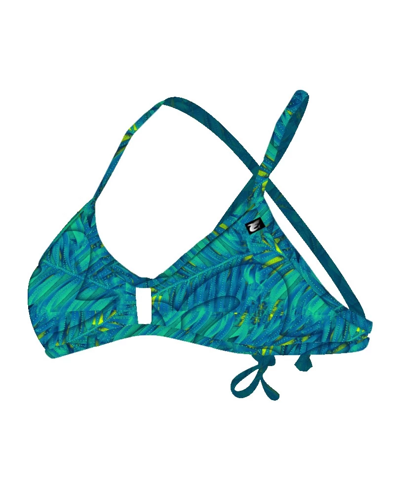 Un ocĂ©an de feuilles sur ce haut de maillot de bain Mad fern aux couleurs bleu lagon avec le dos nouĂ© imprimĂ©, doublure noire.Â